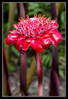 ginger plants* Ginger is about 100 to 150 cm tall with long leaves and looks like a reed. Its rhizome is fleshy – about 20 cm in length and it’s very aromatic. Flower buds are usually white or pink depending on the species. Rhizome’s lemon scent aroma is quite pleasant and the taste is very sweet and spicy.